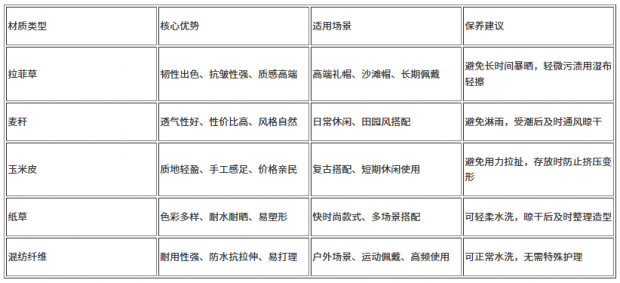 目前市場上的草帽材料以天然植物纖維為核心,部分結合環保合成材料優化性能,常見類型可分為四大類:
